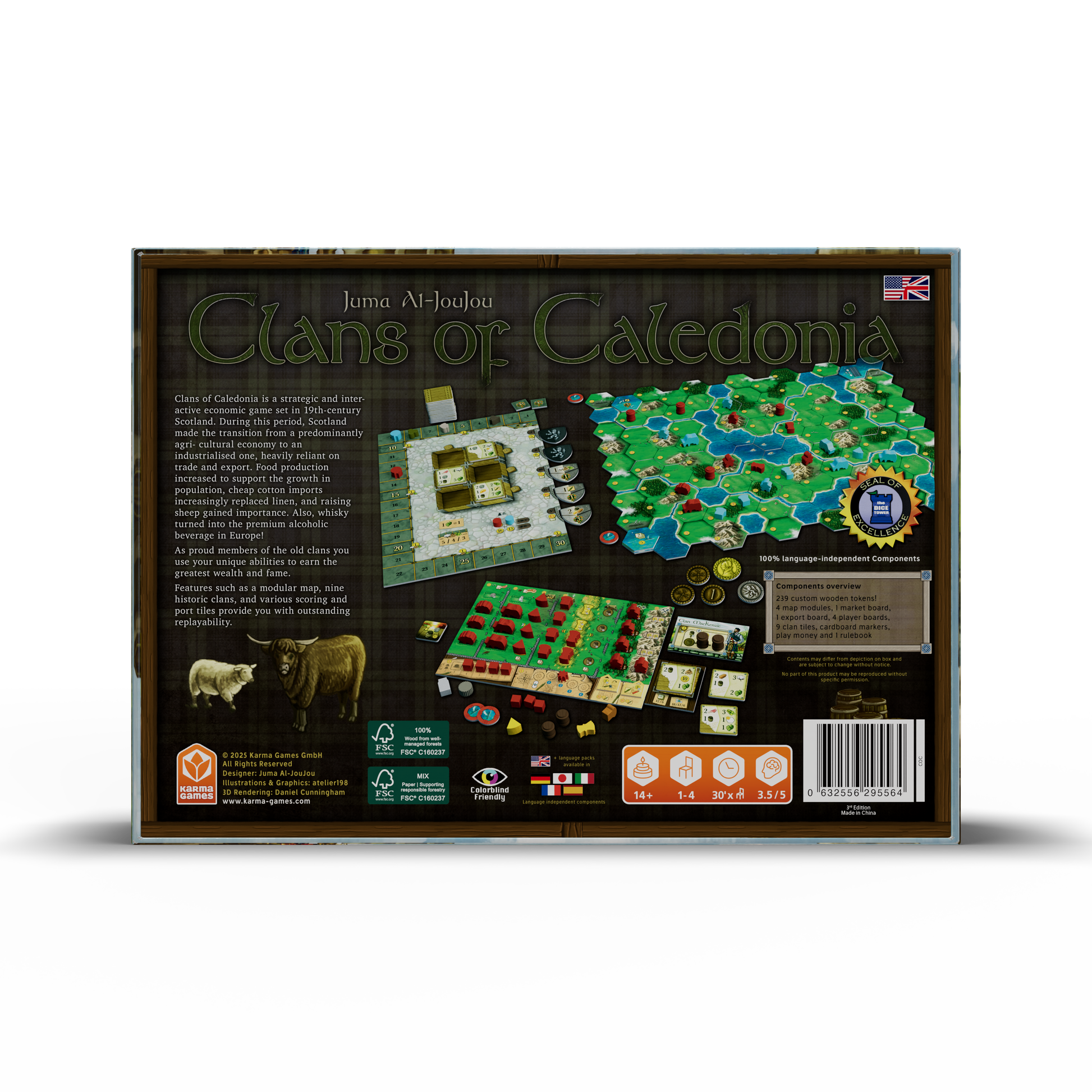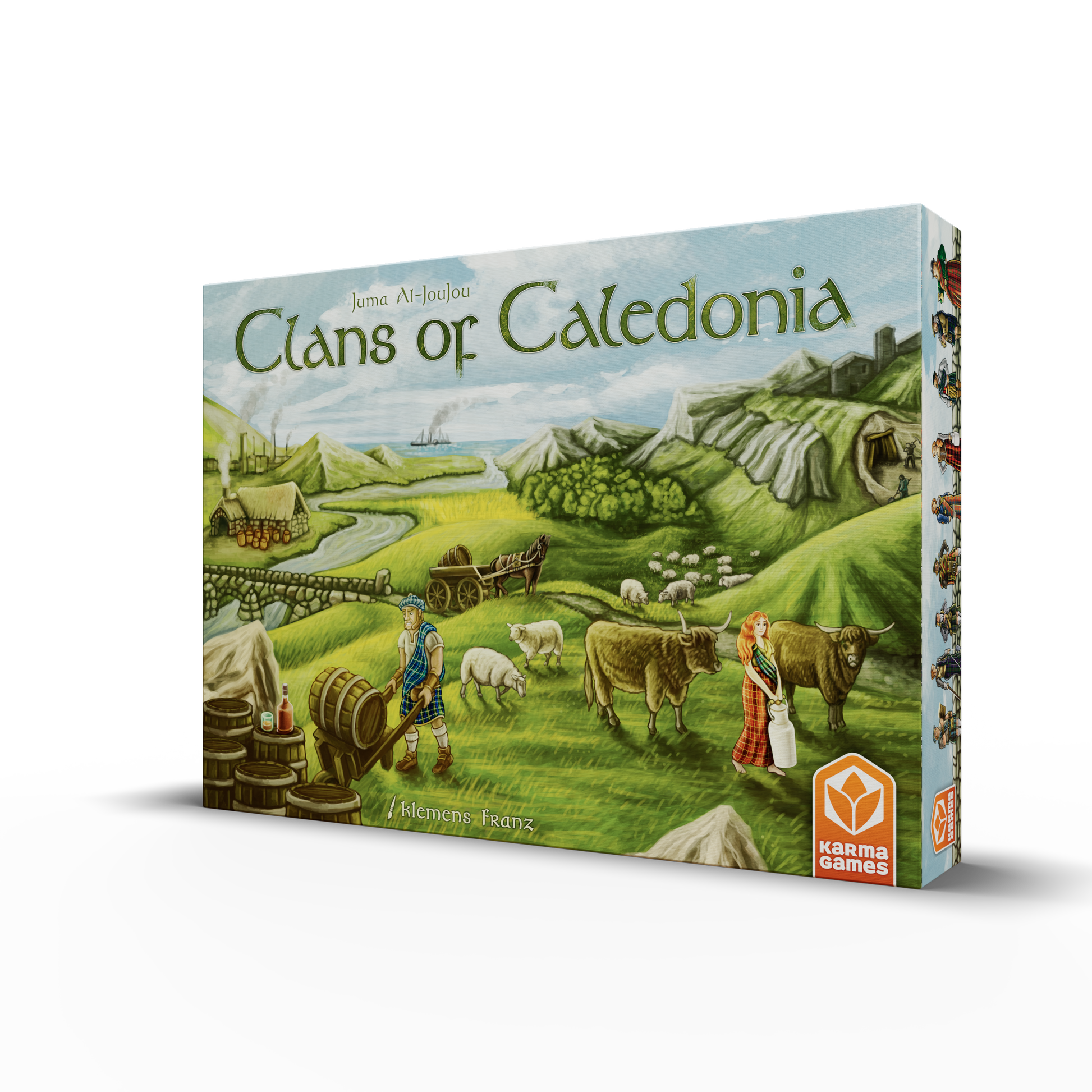 Clans of Caledonia es un juego económico estratégico e interactivo ambientado en la Escocia del siglo XIX. Durante este período, Escocia hizo la transición de una economía predominantemente agrícola a una industrializada, fuertemente dependiente del comercio y la exportación. La producción de alimentos aumentó para apoyar el crecimiento de la población, las importaciones de algodón barato reemplazaron cada vez más a los lienzos, y la cría de ovejas ganó importancia. ¡Además, el whisky se convirtió en la bebida alcohólica premium en Europa!