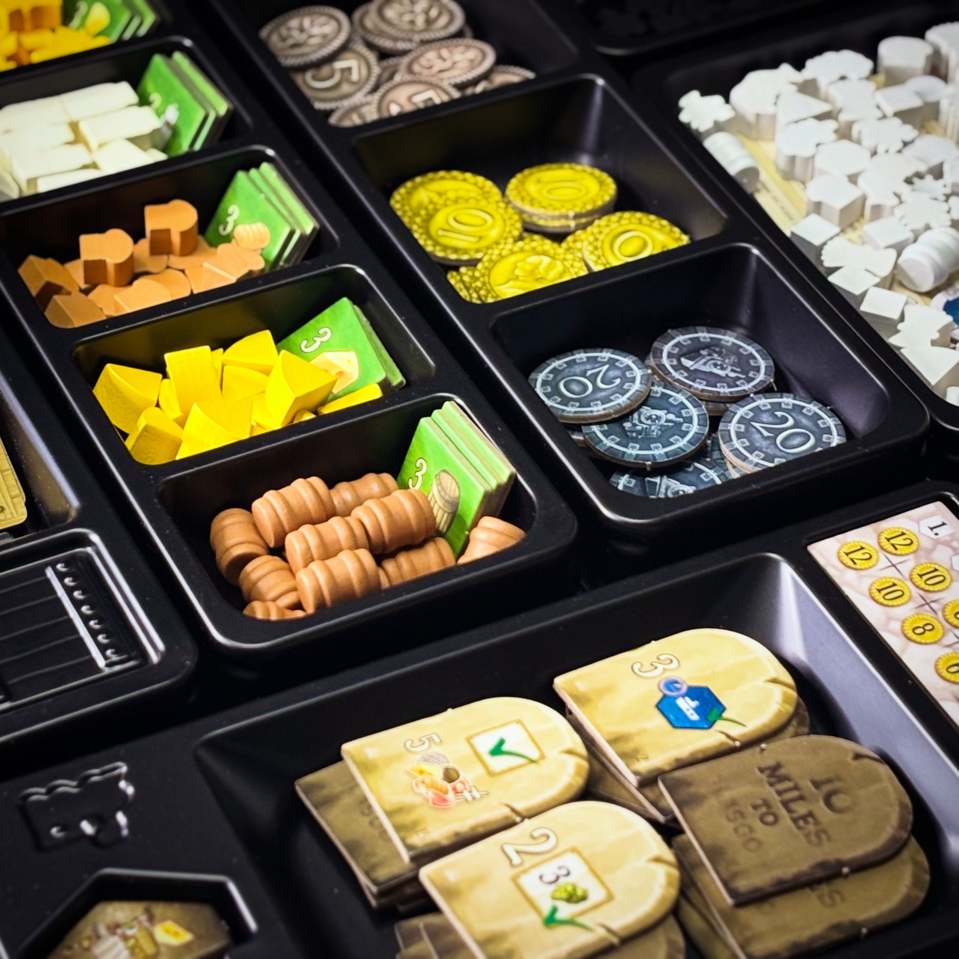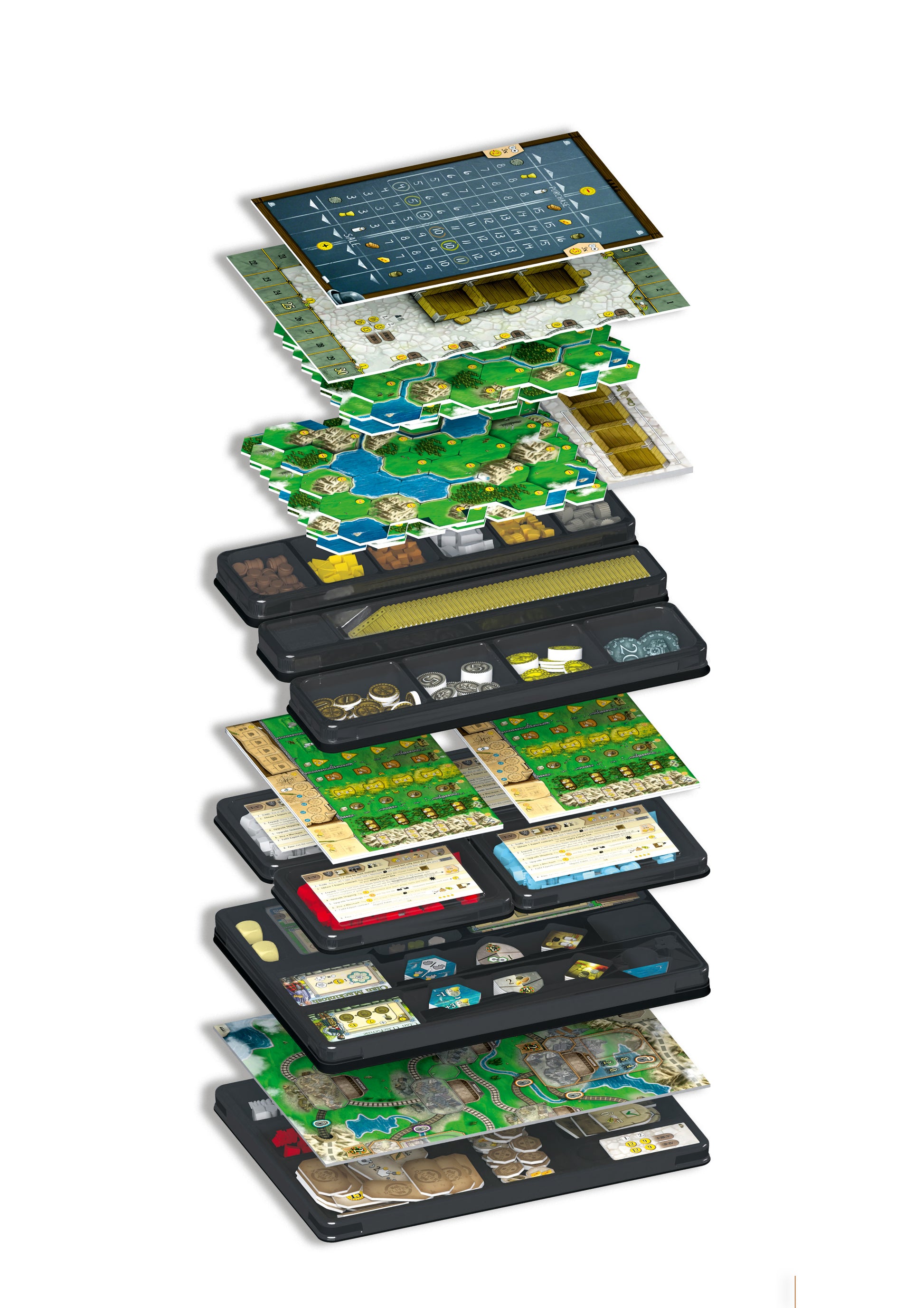 Clans of Caledonia (base game) and the Clans of Caledonia: Industria expansion comes with a single big box with a custom plastic insert that fits in all components of the base game and of the expansion.